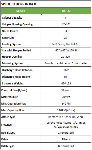 Chip brush, branches and leaves into perfect-size chips for groundcover on pathways or in flower beds with the Farmer Helper Skid Steer attach wood chipper. Perfect for woodlot owners, arborists, and municipalities.Air intake vents maximize blowing force to power the chips out of the chute up to 20 feet.Features a twig breaker to move long material through the rotor compartment, and a 60″ discharge chute with a 360 rotation.Adjustable deflector for accurate placement of wood chips.Hopper easily folds up making it easy to travel on narrow trails, transport and store.Comes complete with hoses and Standard couplers. (No exchange available)Standard-flow, chips branches up to 4″ in diameter into valuable wood chips.This easy to use attachment features a 20″ x 20″ self-feeding hopper opening to handle large, awkward size branches up to 4″ in diameter, and angles brush against the blades as it pulls material into the chipper.The 25″ rotor features 4 hardened-steel reversible chipping blades places at 90 degrees to each other to cut, shear and shred the wood as it moves through the machine.One of the great things about owning skid steer wood chippers is that you can reach many areas that you may never be able to reach with a regular chipper.The Farmer-Helper Wood Chipper for skid steers make nice uniform wood chips that can be used for landscaping, animal bedding, or mulch. The Farmer-Helper Wood Chipper is effective on both softwood and hardwoods both green or seasoned. It is great for cleaning up logging sites, orchards and gardens.When you need a professional wood chipper that will last and last then you need to look into what we have to offer.The versatility of our Skid Steer Mounted wood chipper is unsurpassed. The chipper can be placed in almost any location. The chipping disk is hydraulically powered from your skid steer loader’s hydraulic lines to your auxiliary couplers, start your machine and turn on the flow. The pressure and flow of your machine will power the chipper.